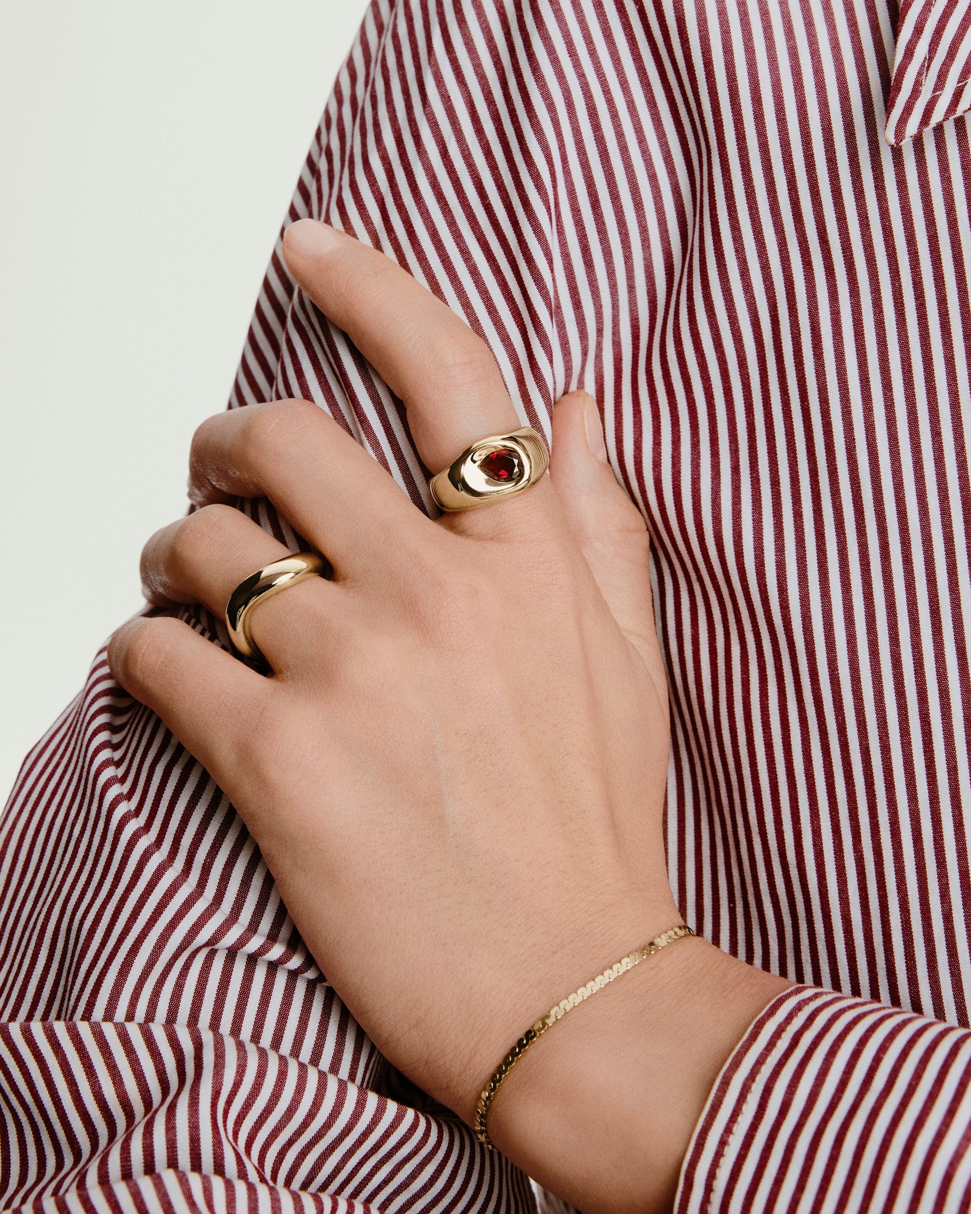We reimagined our iconic Dôme silhouettes with this molten ring featuring a gemstone pressed into the surface. Sculptural, bold, and easy to wear on repeat.